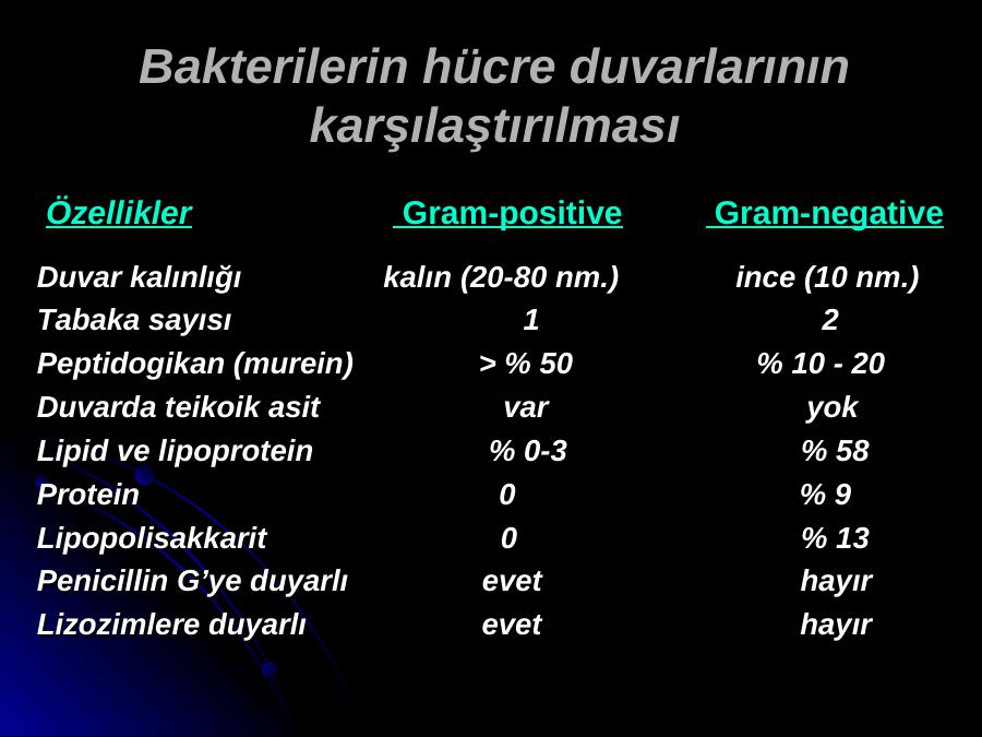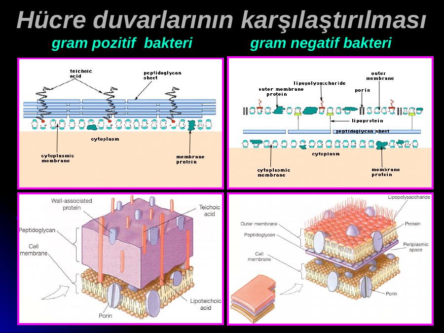 Bakterilerin hücre duvarlarının karşılaştırılmasıÖzellikler Gram-positive Gram-negativeDuvar kalınlığı kalın (20-80 nm.) ince (10 nm.) Tabaka sayısı 1 2Peptidogikan (murein) > % 50 % 10 - 20Duvarda teikoik asit var yokLipid ve lipoprotein % 0-3 % 58Protein 0 % 9 Lipopolisakkarit 0 % 13 Penicillin G’ye duyarlı evet hayırLizozimlere duyarlı evet hayır