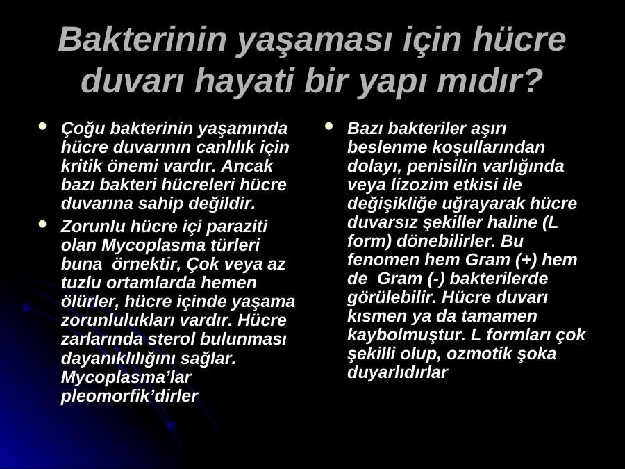 Bakterinin yaşaması için hücre duvarı hayati bir yapı mıdır? Çoğu bakterinin yaşamında hücre duvarının canlılık için kritik önemi vardır. Ancak bazı bakteri hücreleri hücre duvarına sahip değildir. Zorunlu hücre içi paraziti olan Mycoplasma türleri buna örnektir, Çok veya az tuzlu ortamlarda hemen ölürler, hücre içinde yaşama zorunlulukları vardır. Hücre zarlarında sterol bulunması dayanıklılığını sağlar. Mycoplasma’lar pleomorfik’dirler Bazı bakteriler aşırı beslenme koşullarından dolayı, penisilin varlığında veya lizozim etkisi ile değişikliğe uğrayarak hücre duvarsız şekiller haline (L form) dönebilirler. Bu fenomen hem Gram (+) hem de Gram (-) bakterilerde görülebilir. Hücre duvarı kısmen ya da tamamen kaybolmuştur. L formları çok şekilli olup, ozmotik şoka duyarlıdırlar