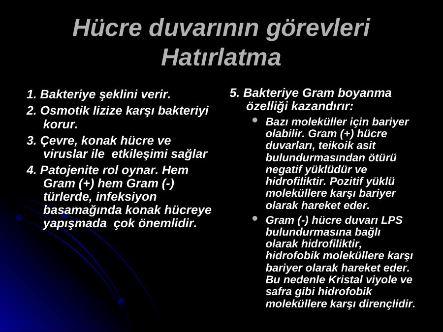 Hücre duvarının görevleriHatırlatma1. Bakteriye şeklini verir. 2. Osmotik lizize karşı bakteriyi korur. 3. Çevre, konak hücre ve viruslar ile etkileşimi sağlar 4. Patojenite rol oynar. Hem Gram (+) hem Gram (-) türlerde, infeksiyon basamağında konak hücreye yapışmada çok önemlidir. 5. Bakteriye Gram boyanma özelliği kazandırır: Bazı moleküller için bariyer olabilir. Gram (+) hücre duvarları, teikoik asit bulundurmasından ötürü negatif yüklüdür ve hidrofiliktir. Pozitif yüklü moleküllere karşı bariyer olarak hareket eder. Gram (-) hücre duvarı LPS bulundurmasına bağlı olarak hidrofiliktir, hidrofobik moleküllere karşı bariyer olarak hareket eder. Bu nedenle Kristal viyole ve safra gibi hidrofobik moleküllere karşı dirençlidir.
