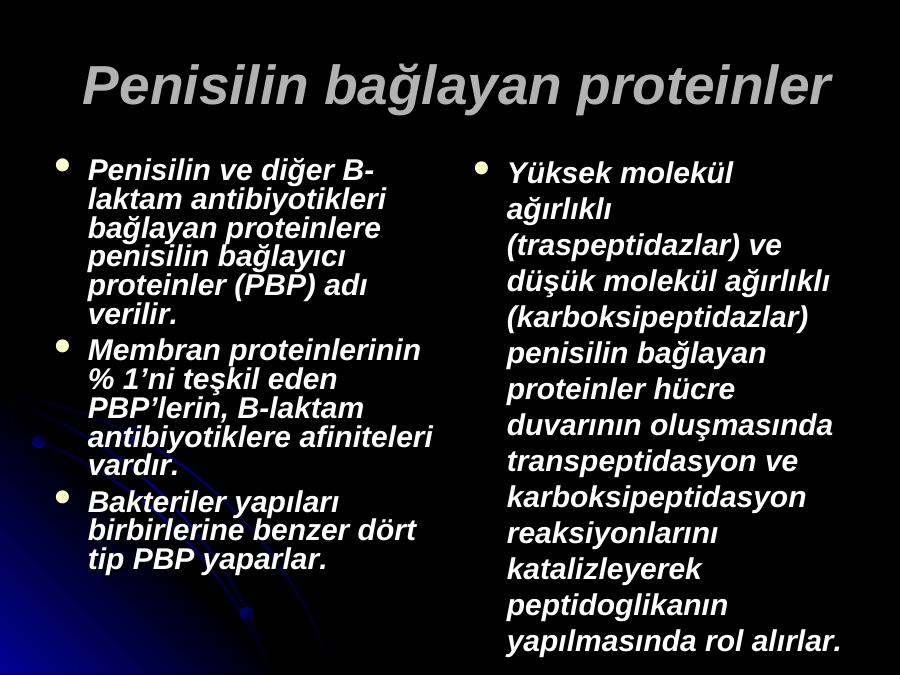 Penisilin bağlayan proteinler Penisilin ve diğer B-laktam antibiyotikleri bağlayan proteinlere penisilin bağlayıcı proteinler (PBP) adı verilir. Membran proteinlerinin % 1’ni teşkil eden PBP’lerin, B-laktam antibiyotiklere afiniteleri vardır. Bakteriler yapıları birbirlerine benzer dört tip PBP yaparlar. Yüksek molekül ağırlıklı (traspeptidazlar) ve düşük molekül ağırlıklı (karboksipeptidazlar) penisilin bağlayan proteinler hücre duvarının oluşmasında transpeptidasyon ve karboksipeptidasyon reaksiyonlarını katalizleyerek peptidoglikanın yapılmasında rol alırlar.