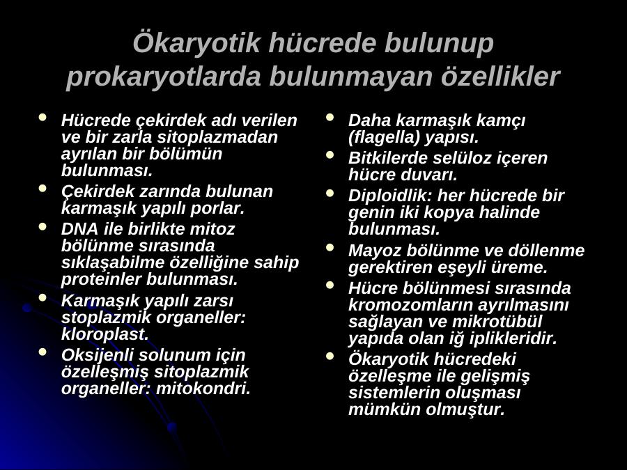 Ökaryotik hücrede bulunup prokaryotlarda bulunmayan özellikler Hücrede çekirdek adı verilen ve bir zarla sitoplazmadan ayrılan bir bölümün bulunması. Çekirdek zarında bulunan karmaşık yapılı porlar. DNA ile birlikte mitoz bölünme sırasında sıklaşabilme özelliğine sahip proteinler bulunması. Karmaşık yapılı zarsı stoplazmik organeller: kloroplast. Oksijenli solunum için özelleşmiş sitoplazmik organeller: mitokondri. Daha karmaşık kamçı (flagella) yapısı. Bitkilerde selüloz içeren hücre duvarı. Diploidlik: her hücrede bir genin iki kopya halinde bulunması. Mayoz bölünme ve döllenme gerektiren eşeyli üreme. Hücre bölünmesi sırasında kromozomların ayrılmasını sağlayan ve mikrotübül yapıda olan iğ iplikleridir. Ökaryotik hücredeki özelleşme ile gelişmiş sistemlerin oluşması mümkün olmuştur.
