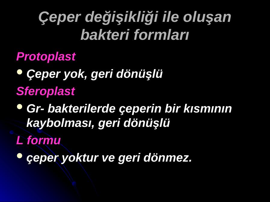 Çeper değişikliği ile oluşan bakteri formlarıProtoplastÇeper yok, geri dönüşlüSferoplastGr- bakterilerde çeperin bir kısmının kaybolması, geri dönüşlüL formuçeper yoktur ve geri dönmez.