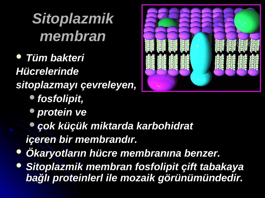 Sitoplazmik membran Tüm bakteri Hücrelerindesitoplazmayı çevreleyen, fosfolipit, protein ve çok küçük miktarda karbohidrat içeren bir membrandır. Ökaryotların hücre membranına benzer. Sitoplazmik membran fosfolipit çift tabakaya bağlı proteinlerl ile mozaik görünümündedir.