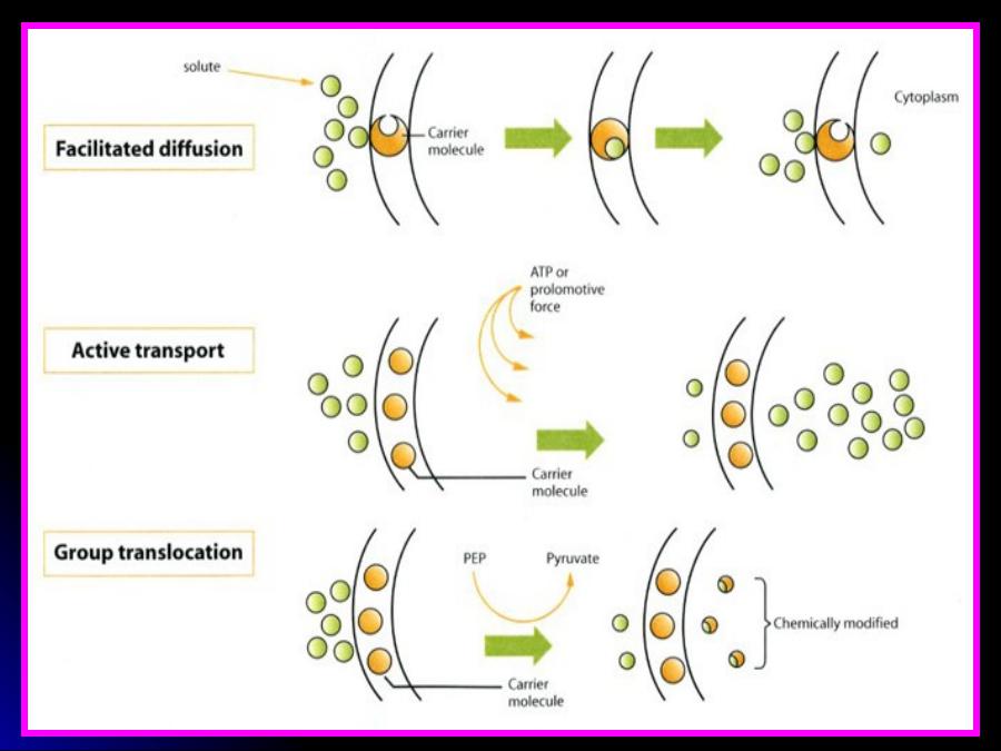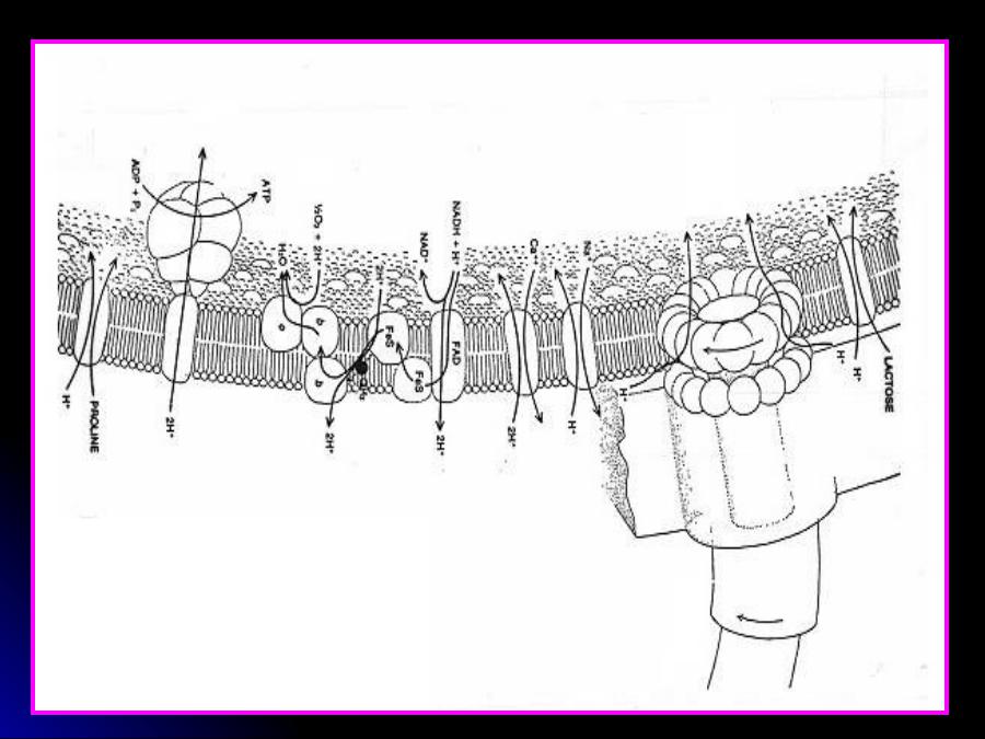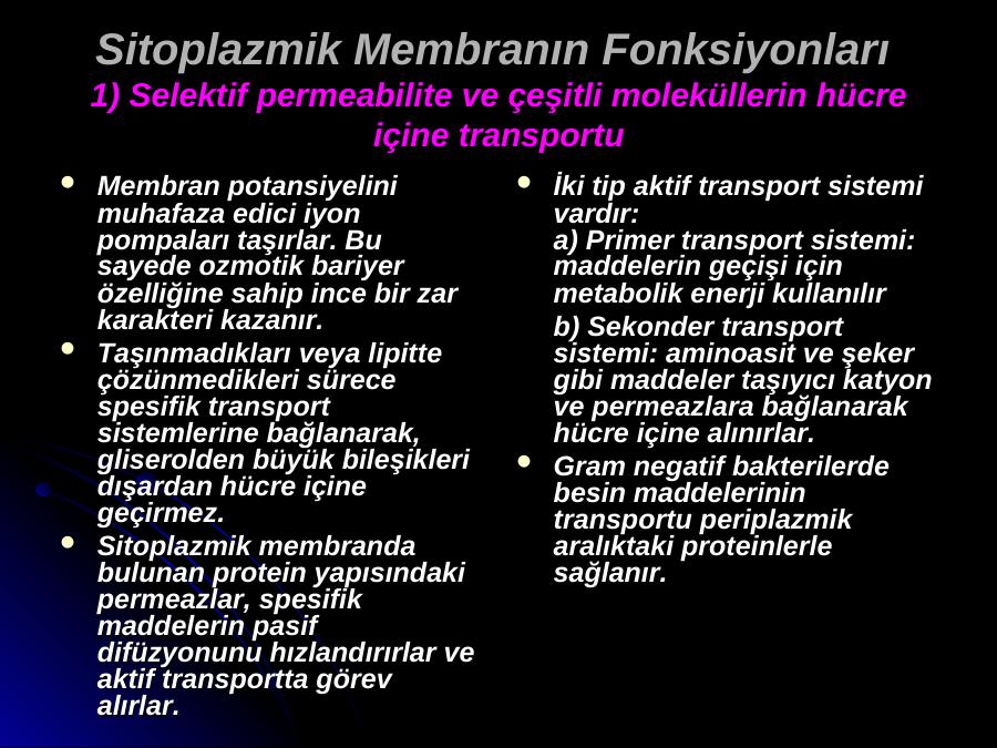 Sitoplazmik Membranın Fonksiyonları 1) Selektif permeabilite ve çeşitli moleküllerin hücre içine transportu Membran potansiyelini muhafaza edici iyon pompaları taşırlar. Bu sayede ozmotik bariyer özelliğine sahip ince bir zar karakteri kazanır. Taşınmadıkları veya lipitte çözünmedikleri sürece spesifik transport sistemlerine bağlanarak, gliserolden büyük bileşikleri dışardan hücre içine geçirmez. Sitoplazmik membranda bulunan protein yapısındaki permeazlar, spesifik maddelerin pasif difüzyonunu hızlandırırlar ve aktif transportta görev alırlar. İki tip aktif transport sistemi vardır:a) Primer transport sistemi: maddelerin geçişi için metabolik enerji kullanılırb) Sekonder transport sistemi: aminoasit ve şeker gibi maddeler taşıyıcı katyon ve permeazlara bağlanarak hücre içine alınırlar. Gram negatif bakterilerde besin maddelerinin transportu periplazmik aralıktaki proteinlerle sağlanır.