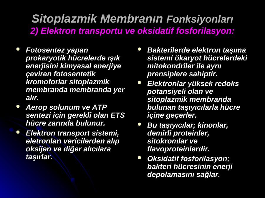 Sitoplazmik Membranın Fonksiyonları2) Elektron transportu ve oksidatif fosforilasyon: Fotosentez yapan prokaryotik hücrelerde ışık enerjisini kimyasal enerjiye çeviren fotosentetik kromoforlar sitoplazmik membranda membranda yer alır. Aerop solunum ve ATP sentezi için gerekli olan ETS hücre zarında bulunur. Elektron transport sistemi, eletronları vericilerden alıp oksijen ve diğer alıcılara taşırlar. Bakterilerde elektron taşıma sistemi ökaryot hücrelerdeki mitokondriler ile aynı prensiplere sahiptir. Elektronlar yüksek redoks potansiyeli olan ve sitoplazmik membranda bulunan taşıyıcılarla hücre içine geçerler. Bu taşıyıcılar; kinonlar, demirli proteinler, sitokromlar ve flavoproteinlerdir. Oksidatif fosforilasyon; bakteri hücresinin enerji depolamasını sağlar.