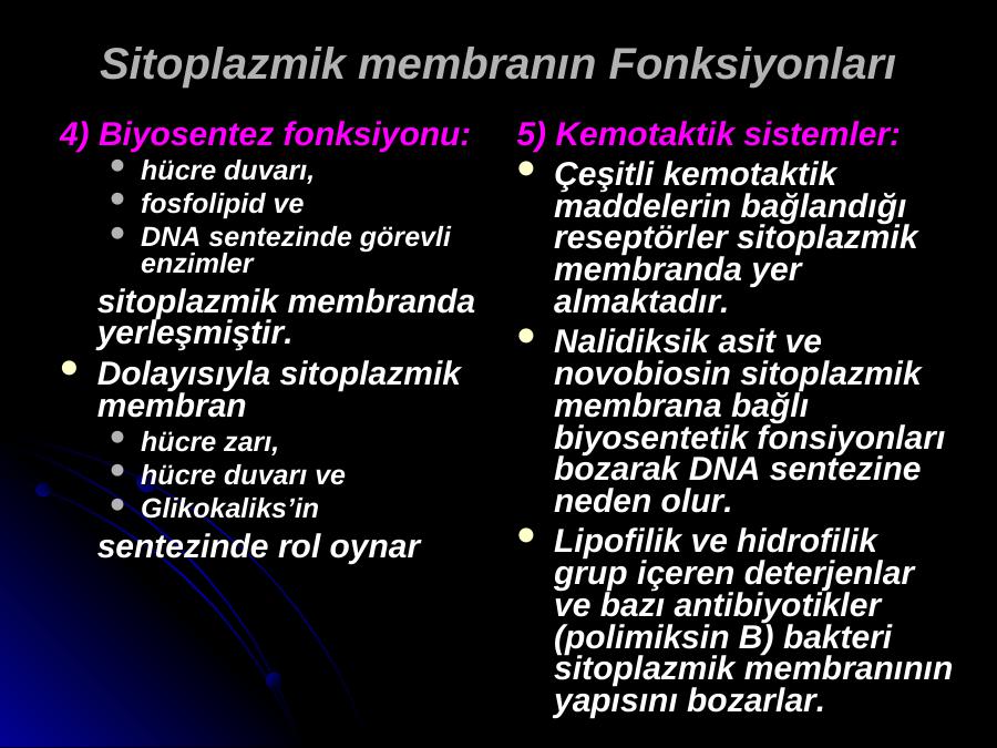 Sitoplazmik membranın Fonksiyonları4) Biyosentez fonksiyonu: hücre duvarı, fosfolipid ve DNA sentezinde görevli enzimler sitoplazmik membranda yerleşmiştir. Dolayısıyla sitoplazmik membran hücre zarı, hücre duvarı ve Glikokaliks’in sentezinde rol oynar 5) Kemotaktik sistemler: Çeşitli kemotaktik maddelerin bağlandığı reseptörler sitoplazmik membranda yer almaktadır. Nalidiksik asit ve novobiosin sitoplazmik membrana bağlı biyosentetik fonsiyonları bozarak DNA sentezine neden olur. Lipofilik ve hidrofilik grup içeren deterjenlar ve bazı antibiyotikler (polimiksin B) bakteri sitoplazmik membranının yapısını bozarlar.