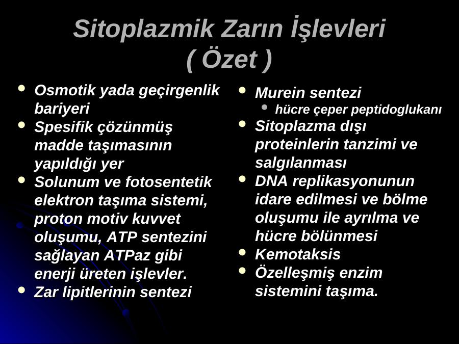 Sitoplazmik Zarın İşlevleri( Özet ) Osmotik yada geçirgenlik bariyeri Spesifik çözünmüş madde taşımasının yapıldığı yer Solunum ve fotosentetik elektron taşıma sistemi, proton motiv kuvvet oluşumu, ATP sentezini sağlayan ATPaz gibi enerji üreten işlevler. Zar lipitlerinin sentezi Murein sentezi hücre çeper peptidoglukanı Sitoplazma dışı proteinlerin tanzimi ve salgılanması DNA replikasyonunun idare edilmesi ve bölme oluşumu ile ayrılma ve hücre bölünmesi Kemotaksis Özelleşmiş enzim sistemini taşıma.