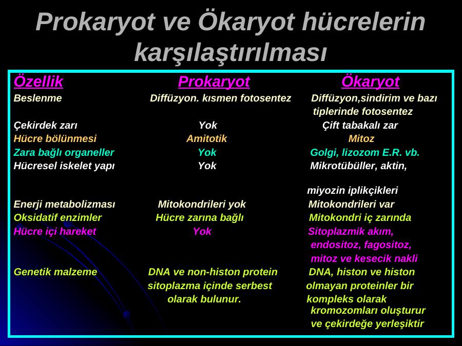 Prokaryot ve Ökaryot hücrelerin karşılaştırılmasıÖzellik Prokaryot ÖkaryotBeslenme Diffüzyon. kısmen fotosentez Diffüzyon,sindirim ve bazı tiplerinde fotosentezÇekirdek zarı Yok Çift tabakalı zarHücre bölünmesi Amitotik MitozZara bağlı organeller Yok Golgi, lizozom E.R. vb.Hücresel iskelet yapı Yok Mikrotübüller, aktin, miyozin iplikçikleriEnerji metabolizması Mitokondrileri yok Mitokondrileri varOksidatif enzimler Hücre zarına bağlı Mitokondri iç zarındaHücre içi hareket Yok Sitoplazmik akım, endositoz, fagositoz, mitoz ve kesecik nakliGenetik malzeme DNA ve non-histon protein DNA, histon ve histon sitoplazma içinde serbest olmayan proteinler bir olarak bulunur. kompleks olarak kromozomları oluşturur ve çekirdeğe yerleşiktir