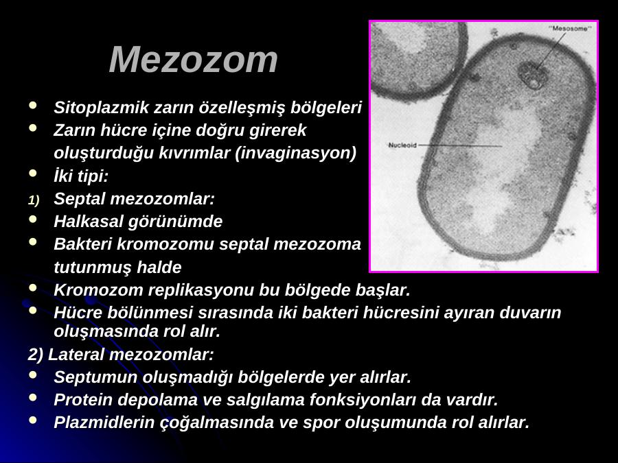 Mezozom Sitoplazmik zarın özelleşmiş bölgeleri Zarın hücre içine doğru girerek oluşturduğu kıvrımlar (invaginasyon) İki tipi: 1) Septal mezozomlar: Halkasal görünümde Bakteri kromozomu septal mezozoma tutunmuş halde Kromozom replikasyonu bu bölgede başlar. Hücre bölünmesi sırasında iki bakteri hücresini ayıran duvarın oluşmasında rol alır. 2) Lateral mezozomlar: Septumun oluşmadığı bölgelerde yer alırlar. Protein depolama ve salgılama fonksiyonları da vardır. Plazmidlerin çoğalmasında ve spor oluşumunda rol alırlar.