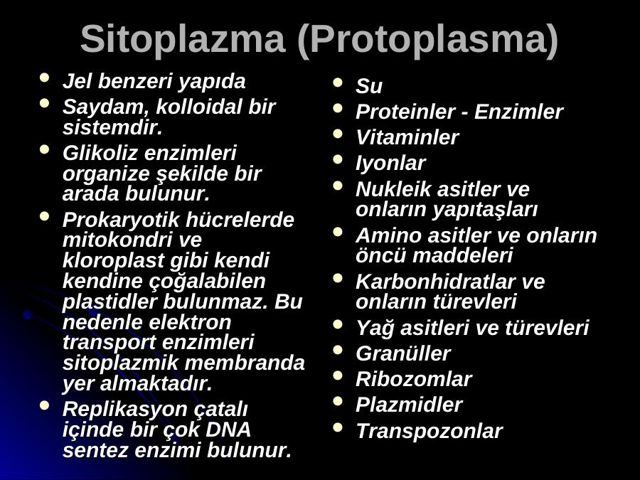 Sitoplazma (Protoplasma) Jel benzeri yapıda Saydam, kolloidal bir sistemdir. Glikoliz enzimleri organize şekilde bir arada bulunur. Prokaryotik hücrelerde mitokondri ve kloroplast gibi kendi kendine çoğalabilen plastidler bulunmaz. Bu nedenle elektron transport enzimleri sitoplazmik membranda yer almaktadır. Replikasyon çatalı içinde bir çok DNA sentez enzimi bulunur. Su Proteinler - Enzimler Vitaminler Iyonlar Nukleik asitler ve onların yapıtaşları Amino asitler ve onların öncü maddeleri Karbonhidratlar ve onların türevleri Yağ asitleri ve türevleri Granüller Ribozomlar Plazmidler Transpozonlar