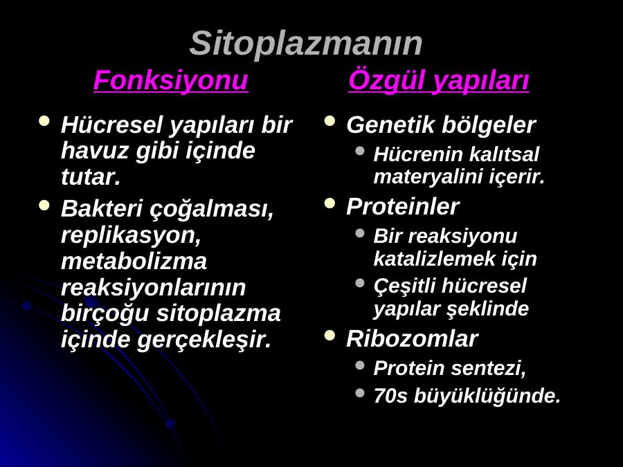 Sitoplazmanın Fonksiyonu Özgül yapıları Hücresel yapıları bir havuz gibi içinde tutar. Bakteri çoğalması, replikasyon, metabolizma reaksiyonlarının birçoğu sitoplazma içinde gerçekleşir. Genetik bölgeler Hücrenin kalıtsal materyalini içerir. Proteinler Bir reaksiyonu katalizlemek için Çeşitli hücresel yapılar şeklinde Ribozomlar Protein sentezi, 70s büyüklüğünde.