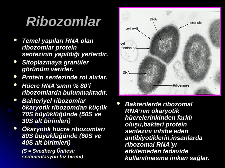 Ribozomlar Temel yapıları RNA olan ribozomlar protein sentezinin yapıldığı yerlerdir. Sitoplazmaya granüler görünüm verirler. Protein sentezinde rol alırlar. Hücre RNA’sının % 80’i ribozomlarda bulunmaktadır. Bakteriyel ribozomlar ökaryotik ribozomdan küçük 70S büyüklüğünde (50S ve 30S alt birimleri) Ökaryotik hücre ribozomları 80S büyüklüğünde (60S ve 40S alt birimleri) (S = Svedberg Ünitesi: sedimentasyon hız birimi) Bakterilerde ribozomal RNA’nın ökaryotik hücrelerinkinden farklı oluşu,bakteri protein sentezini inhibe eden antibiyotiklerin,insanlarda ribozomal RNA’yı etkilemeden tedavide kullanılmasına imkan sağlar.