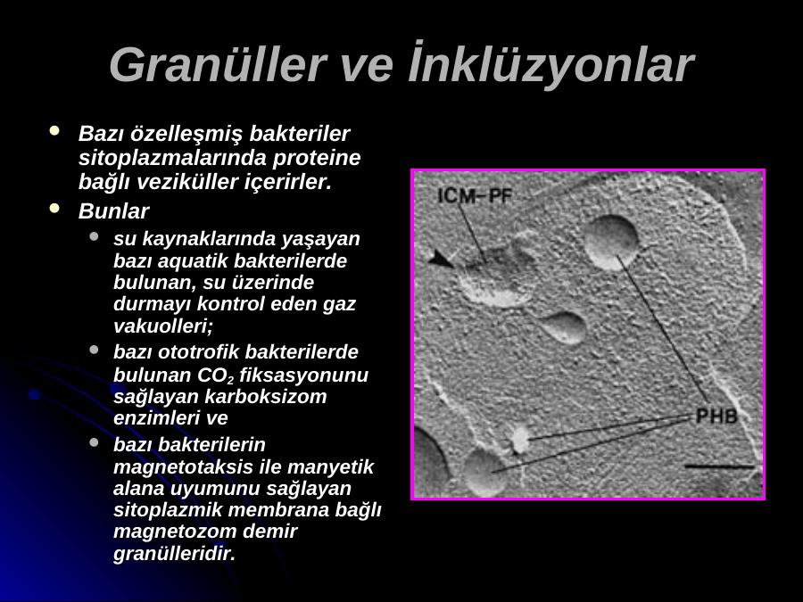 Granüller ve İnklüzyonlar Bazı özelleşmiş bakteriler sitoplazmalarında proteine bağlı veziküller içerirler. Bunlar su kaynaklarında yaşayan bazı aquatik bakterilerde bulunan, su üzerinde durmayı kontrol eden gaz vakuolleri; bazı ototrofik bakterilerde bulunan CO2 fiksasyonunu sağlayan karboksizom enzimleri ve bazı bakterilerin magnetotaksis ile manyetik alana uyumunu sağlayan sitoplazmik membrana bağlı magnetozom demir granülleridir.