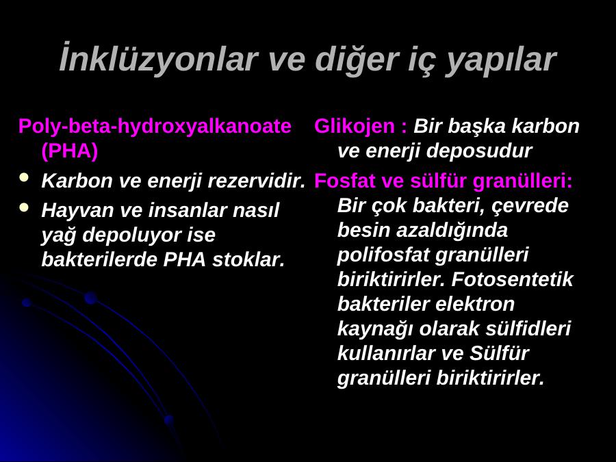 İnklüzyonlar ve diğer iç yapılarPoly-beta-hydroxyalkanoate (PHA) Karbon ve enerji rezervidir. Hayvan ve insanlar nasıl yağ depoluyor ise bakterilerde PHA stoklar.Glikojen : Bir başka karbon ve enerji deposudur Fosfat ve sülfür granülleri: Bir çok bakteri, çevrede besin azaldığında polifosfat granülleri biriktirirler. Fotosentetik bakteriler elektron kaynağı olarak sülfidleri kullanırlar ve Sülfür granülleri biriktirirler.