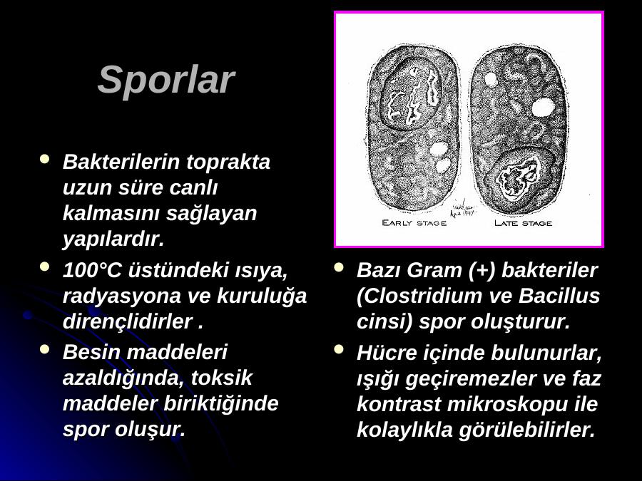 Sporlar Bakterilerin toprakta uzun süre canlı kalmasını sağlayan yapılardır. 100°C üstündeki ısıya, radyasyona ve kuruluğa dirençlidirler . Besin maddeleri azaldığında, toksik maddeler biriktiğinde spor oluşur. Bazı Gram (+) bakteriler (Clostridium ve Bacillus cinsi) spor oluşturur. Hücre içinde bulunurlar, ışığı geçiremezler ve faz kontrast mikroskopu ile kolaylıkla görülebilirler.