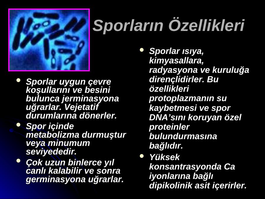 Sporların Özellikleri Sporlar uygun çevre koşullarını ve besini bulunca jerminasyona uğrarlar. Vejetatif durumlarına dönerler. Spor içinde metabolizma durmuştur veya minumum seviyededir. Çok uzun binlerce yıl canlı kalabilir ve sonra germinasyona uğrarlar. Sporlar ısıya, kimyasallara, radyasyona ve kuruluğa dirençlidirler. Bu özellikleri protoplazmanın su kaybetmesi ve spor DNA’sını koruyan özel proteinler bulundurmasına bağlıdır. Yüksek konsantrasyonda Ca iyonlarına bağlı dipikolinik asit içerirler.