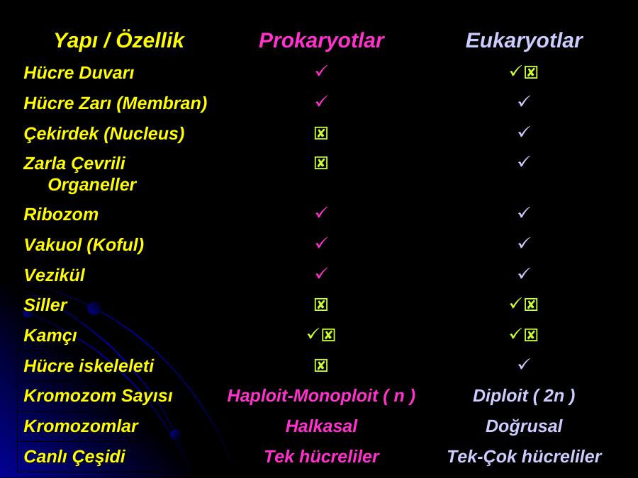 Yapı / Özellik Prokaryotlar EukaryotlarHücre Duvarı Hücre Zarı (Membran) Çekirdek (Nucleus) Zarla Çevrili Organeller Ribozom Vakuol (Koful) Vezikül Siller Kamçı Hücre iskeleleti Kromozom Sayısı Haploit-Monoploit ( n ) Diploit ( 2n )Kromozomlar Halkasal DoğrusalCanlı Çeşidi Tek hücreliler Tek-Çok hücreliler