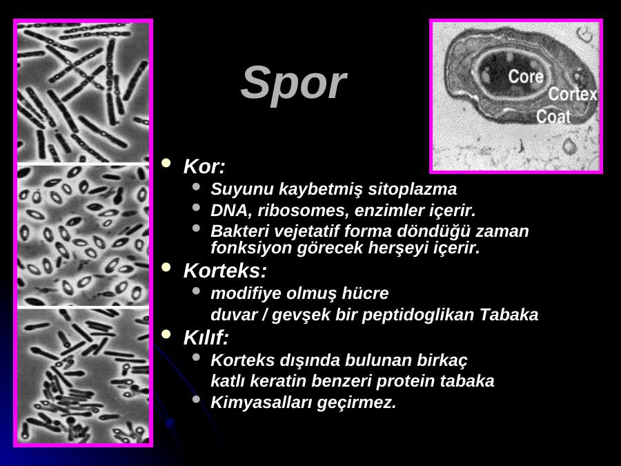 Spor Kor: Suyunu kaybetmiş sitoplazma DNA, ribosomes, enzimler içerir. Bakteri vejetatif forma döndüğü zaman fonksiyon görecek herşeyi içerir. Korteks: modifiye olmuş hücre duvar / gevşek bir peptidoglikan Tabaka Kılıf: Korteks dışında bulunan birkaç katlı keratin benzeri protein tabaka Kimyasalları geçirmez.