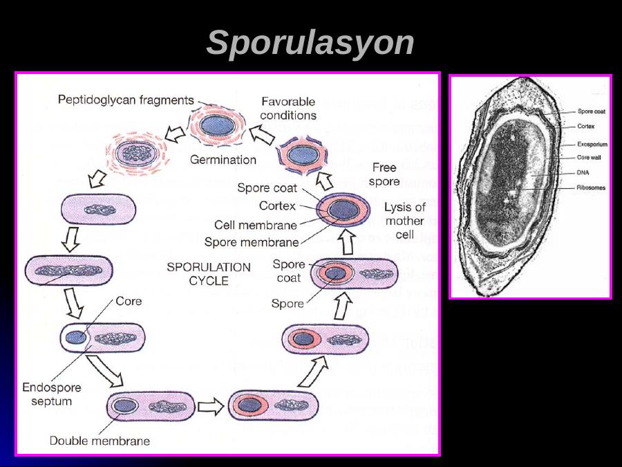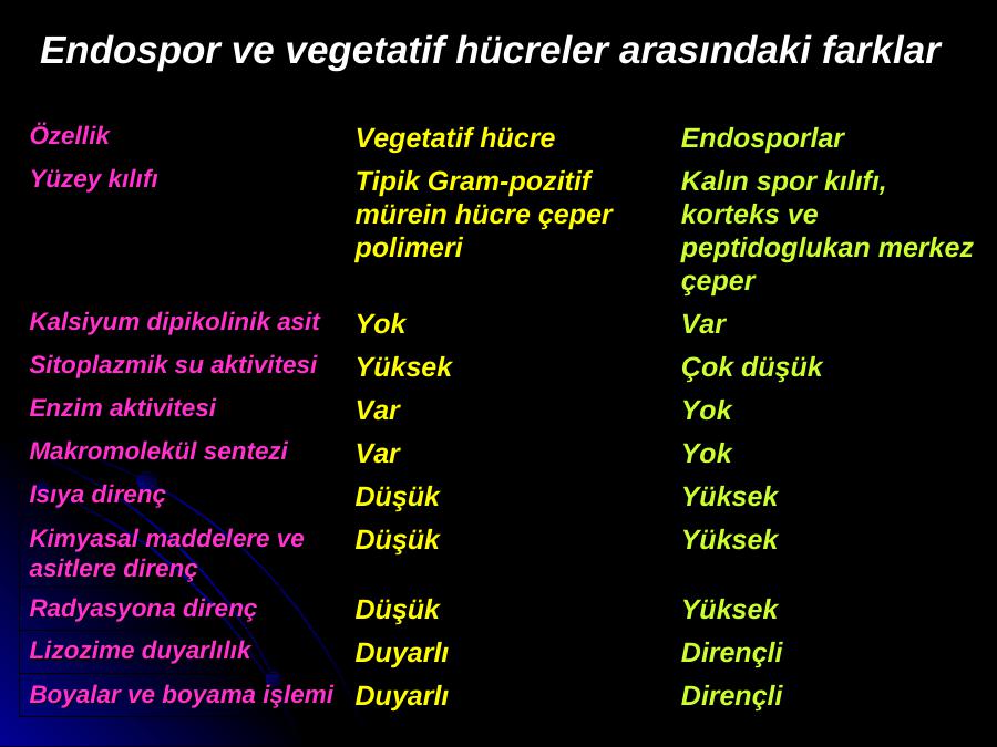 Endospor ve vegetatif hücreler arasındaki farklar Özellik Vegetatif hücre EndosporlarYüzey kılıfı Tipik Gram-pozitif mürein hücre çeper polimeriKalın spor kılıfı, korteks ve peptidoglukan merkez çeperKalsiyum dipikolinik asit Yok VarSitoplazmik su aktivitesi Yüksek Çok düşükEnzim aktivitesi Var YokMakromolekül sentezi Var YokIsıya direnç Düşük YüksekKimyasal maddelere ve asitlere dirençDüşük YüksekRadyasyona direnç Düşük YüksekLizozime duyarlılık Duyarlı DirençliBoyalar ve boyama işlemi Duyarlı Dirençli