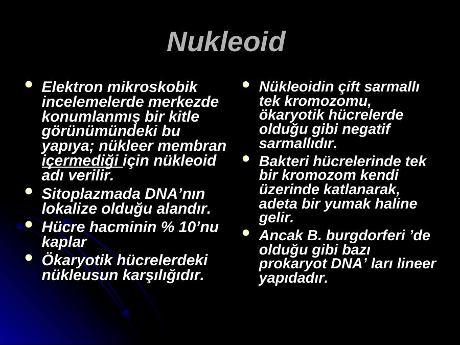 Nukleoid Elektron mikroskobik incelemelerde merkezde konumlanmış bir kitle görünümündeki bu yapıya; nükleer membran içermediği için nükleoid adı verilir. Sitoplazmada DNA’nın lokalize olduğu alandır. Hücre hacminin % 10’nu kaplar Ökaryotik hücrelerdeki nükleusun karşılığıdır. Nükleoidin çift sarmallı tek kromozomu, ökaryotik hücrelerde olduğu gibi negatif sarmallıdır. Bakteri hücrelerinde tek bir kromozom kendi üzerinde katlanarak, adeta bir yumak haline gelir. Ancak B. burgdorferi ’de olduğu gibi bazı prokaryot DNA’ ları lineer yapıdadır.