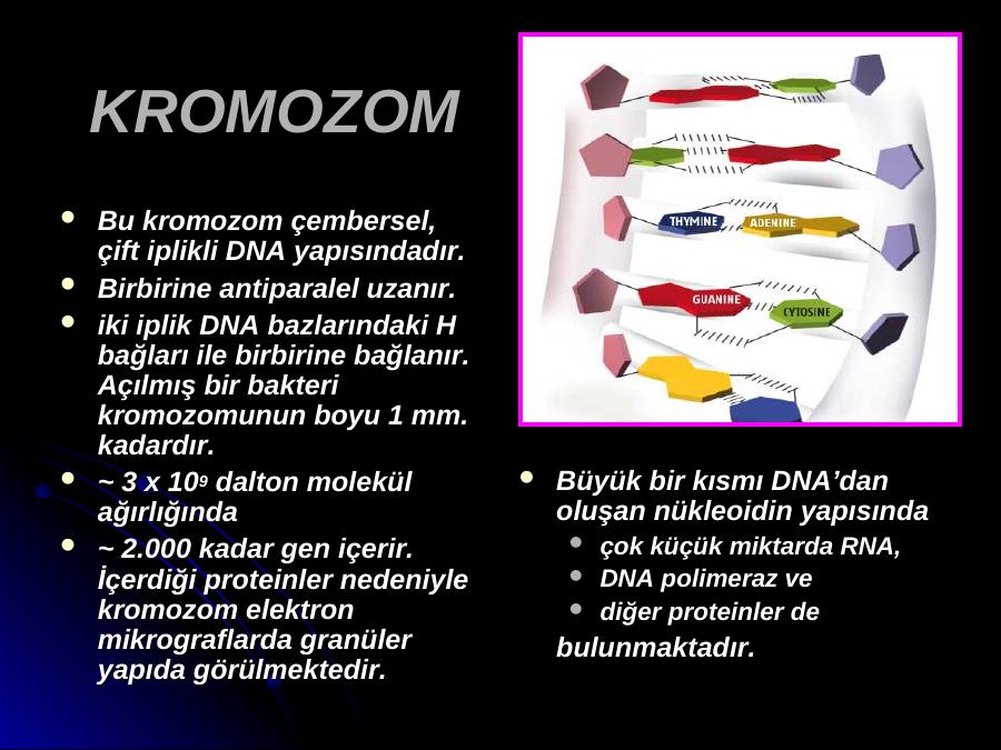 KROMOZOM Bu kromozom çembersel, çift iplikli DNA yapısındadır. Birbirine antiparalel uzanır. iki iplik DNA bazlarındaki H bağları ile birbirine bağlanır. Açılmış bir bakteri kromozomunun boyu 1 mm. kadardır. ~ 3 x 109 dalton molekül ağırlığında ~ 2.000 kadar gen içerir. İçerdiği proteinler nedeniyle kromozom elektron mikrograflarda granüler yapıda görülmektedir. Büyük bir kısmı DNA’dan oluşan nükleoidin yapısında çok küçük miktarda RNA, DNA polimeraz ve diğer proteinler de bulunmaktadır.