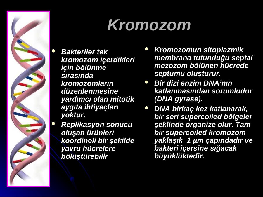 Kromozom Bakteriler tek kromozom içerdikleri için bölünme sırasında kromozomların düzenlenmesine yardımcı olan mitotik aygıta ihtiyaçları yoktur. Replikasyon sonucu oluşan ürünleri koordineli bir şekilde yavru hücrelere bölüştürebilİr Kromozomun sitoplazmik membrana tutunduğu septal mezozom bölünen hücrede septumu oluşturur. Bir dizi enzim DNA’nın katlanmasından sorumludur (DNA gyrase). DNA birkaç kez katlanarak, bir seri supercoiled bölgeler şeklinde organize olur. Tam bir supercoiled kromozom yaklaşık 1 µm çapındadır ve bakteri içersine sığacak büyüklüktedir.
