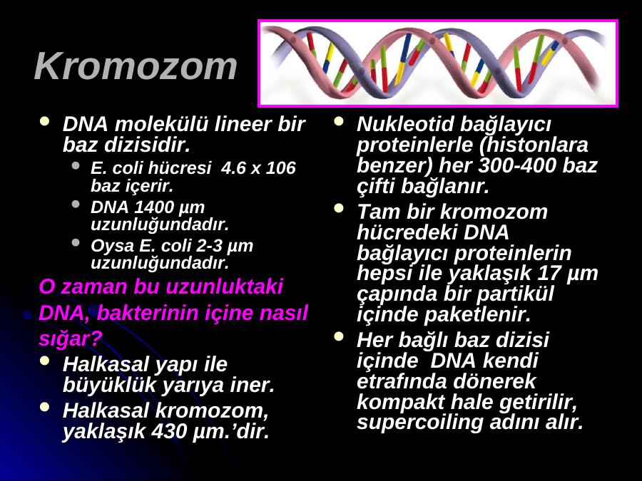 Kromozom DNA molekülü lineer bir baz dizisidir. E. coli hücresi 4.6 x 106 baz içerir. DNA 1400 µm uzunluğundadır. Oysa E. coli 2-3 µm uzunluğundadır. O zaman bu uzunluktaki DNA, bakterinin içine nasılsığar? Halkasal yapı ile büyüklük yarıya iner. Halkasal kromozom, yaklaşık 430 µm.’dir. Nukleotid bağlayıcı proteinlerle (histonlara benzer) her 300-400 baz çifti bağlanır. Tam bir kromozom hücredeki DNA bağlayıcı proteinlerin hepsi ile yaklaşık 17 µm çapında bir partikül içinde paketlenir. Her bağlı baz dizisi içinde DNA kendi etrafında dönerek kompakt hale getirilir, supercoiling adını alır.