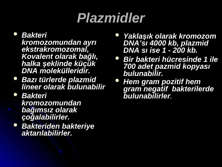 Plazmidler Bakteri kromozomundan ayrı ekstrakromozomal, Kovalent olarak bağlı, halka şeklinde küçük DNA molekülleridir. Bazı türlerde plazmid lineer olarak bulunabilir Bakteri kromozomundan bağımsız olarak çoğalabilirler. Bakteriden bakteriye aktarılabilirler. Yaklaşık olarak kromozom DNA’sı 4000 kb, plazmid DNA sı ise 1 - 200 kb. Bir bakteri hücresinde 1 ile 700 adet pazmid kopyası bulunabilir. Hem gram pozitif hem gram negatif bakterilerde bulunabilirler.