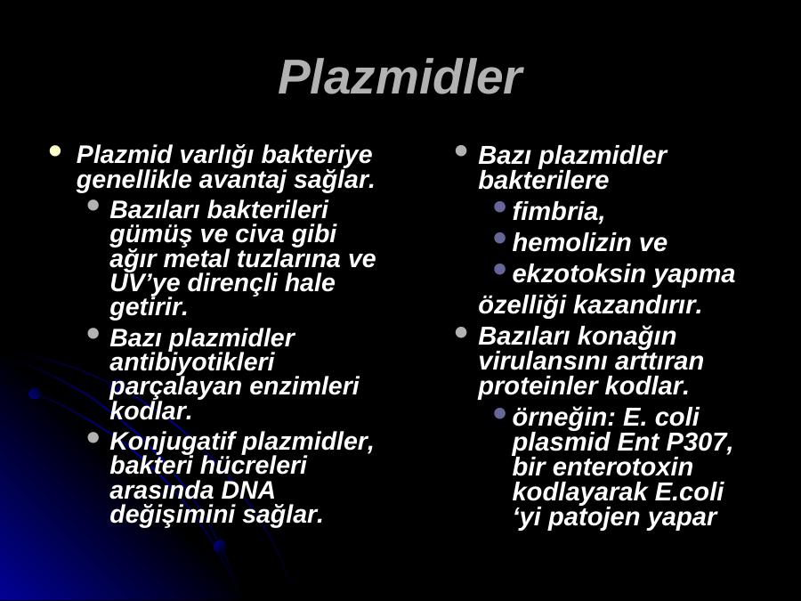 Plazmidler Plazmid varlığı bakteriye genellikle avantaj sağlar. Bazıları bakterileri gümüş ve civa gibi ağır metal tuzlarına ve UV’ye dirençli hale getirir. Bazı plazmidler antibiyotikleri parçalayan enzimleri kodlar. Konjugatif plazmidler, bakteri hücreleri arasında DNA değişimini sağlar. Bazı plazmidler bakterilere fimbria, hemolizin ve ekzotoksin yapma özelliği kazandırır. Bazıları konağın virulansını arttıran proteinler kodlar. örneğin: E. coli plasmid Ent P307, bir enterotoxin kodlayarak E.coli ‘yi patojen yapar