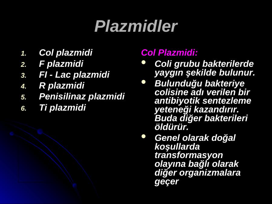 Plazmidler1. Col plazmidi2. F plazmidi3. FI - Lac plazmidi4. R plazmidi5. Penisilinaz plazmidi6. Ti plazmidiCol Plazmidi: Coli grubu bakterilerde yaygın şekilde bulunur. Bulunduğu bakteriye colisine adı verilen bir antibiyotik sentezleme yeteneği kazandırır. Buda diğer bakterileri öldürür. Genel olarak doğal koşullarda transformasyon olayına bağlı olarak diğer organizmalara geçer