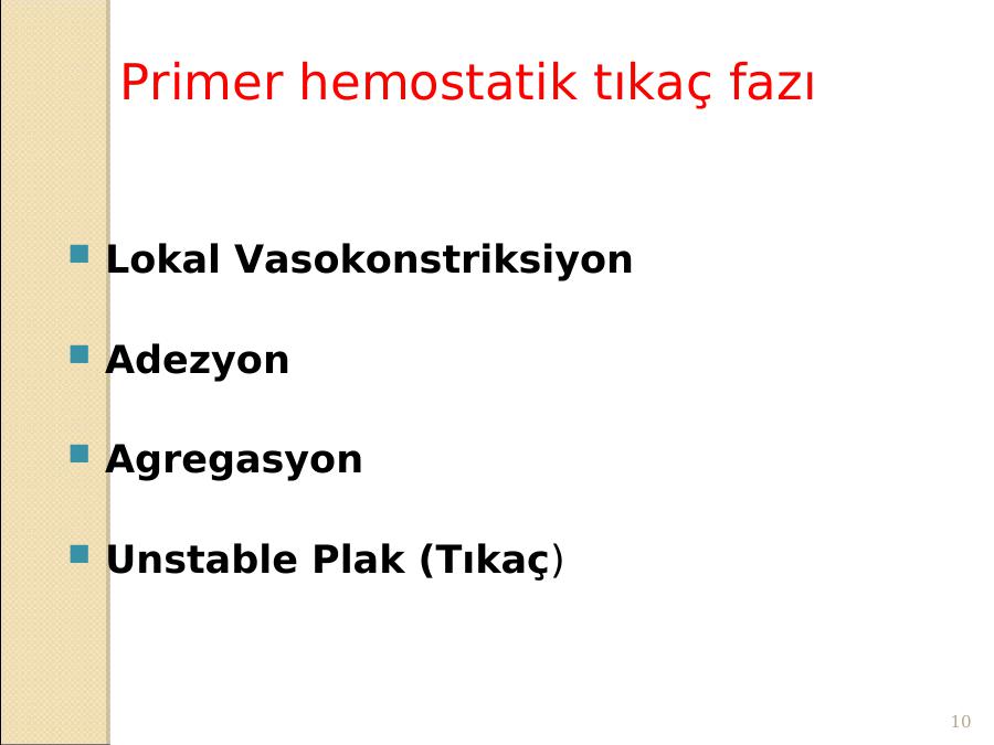 Hemostatik Mekanizma Hemostaz üç basamaklı bir işlem sonucu gerçekleşir. 1) Primer hemostatik tıkaç fazı : Hasarlanmış endotel hücreleri ve plateletlerin etkileşimi sonucu oluşur. 2) Koagulasyon fazı : Platelet iskelesi üzerinde trombin ve fibrin oluşumu ile sonuçlanır. 3) Stabil fibrin fazı : Fibrin molekülleri arasında peptid bağlarının oluşumu ile sağlam fibrin ağı oluşturulur. 9