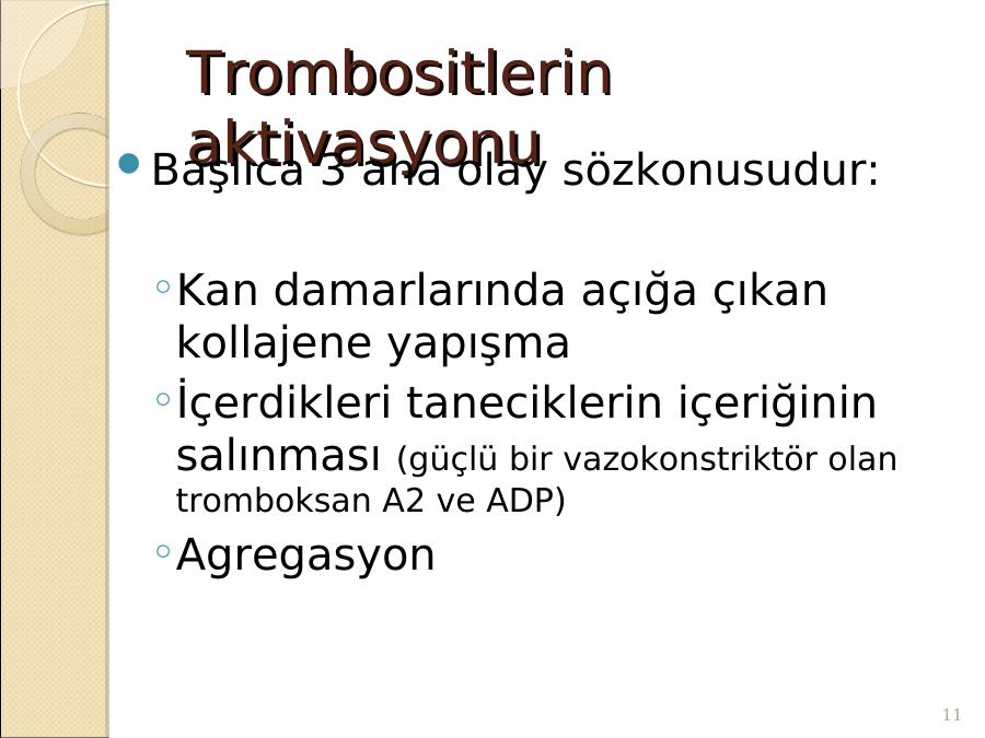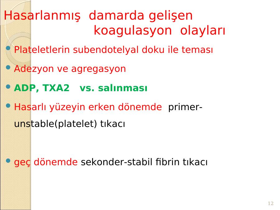 Trombositlerin aktivasyonu Başlıca 3 ana olay sözkonusudur: ◦Kan damarlarında açığa çıkan kollajene yapışma ◦İçerdikleri taneciklerin içeriğinin salınması (güçlü bir vazokonstriktör olan tromboksan A2 ve ADP) ◦Agregasyon 11