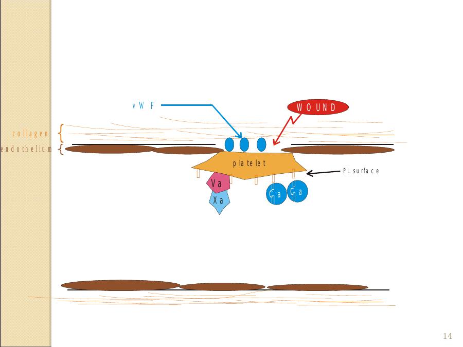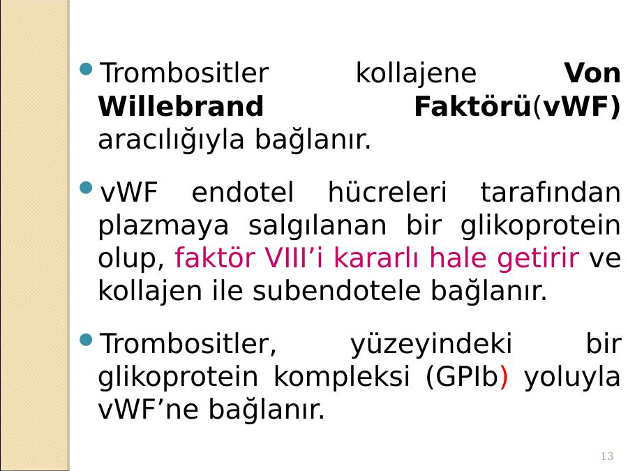 13 Trombositler kollajene Von Willebrand Faktörü(vWF) aracılığıyla bağlanır. vWF endotel hücreleri tarafından plazmaya salgılanan bir glikoprotein olup, faktör VIII’i kararlı hale getirir ve kollajen ile subendotele bağlanır. Trombositler, yüzeyindeki bir glikoprotein kompleksi (GPIb) yoluyla vWF’ne bağlanır.
