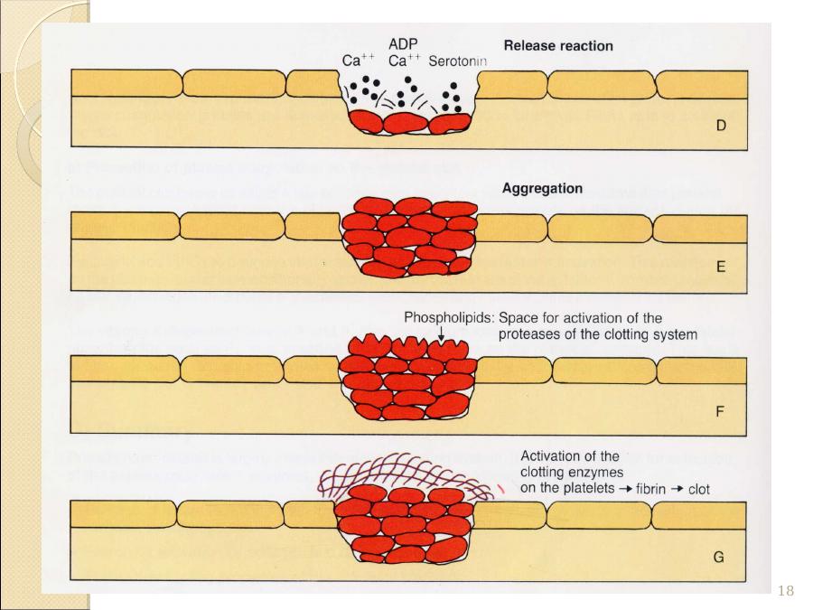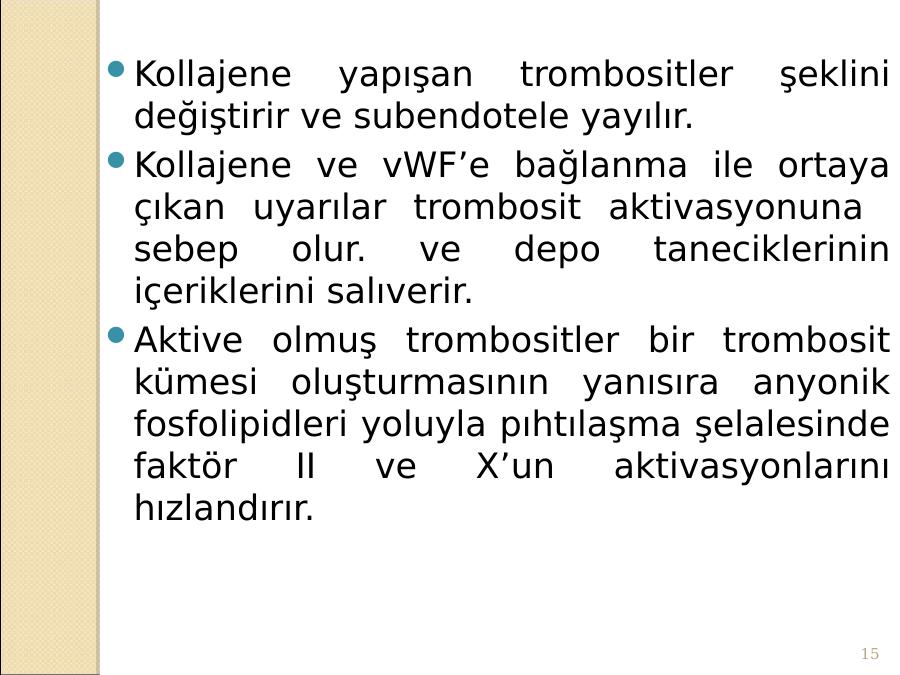 15 Kollajene yapışan trombositler şeklini değiştirir ve subendotele yayılır. Kollajene ve vWF’e bağlanma ile ortaya çıkan uyarılar trombosit aktivasyonuna sebep olur. ve depo taneciklerinin içeriklerini salıverir. Aktive olmuş trombositler bir trombosit kümesi oluşturmasının yanısıra anyonik fosfolipidleri yoluyla pıhtılaşma şelalesinde faktör II ve X’un aktivasyonlarını hızlandırır.