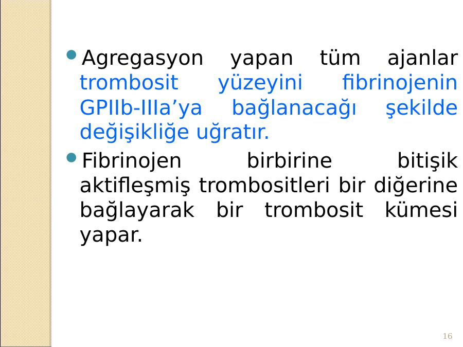 16 Agregasyon yapan tüm ajanlar trombosit yüzeyini fibrinojenin GPIIb-IIIa’ya bağlanacağı şekilde değişikliğe uğratır. Fibrinojen birbirine bitişik aktifleşmiş trombositleri bir diğerine bağlayarak bir trombosit kümesi yapar.