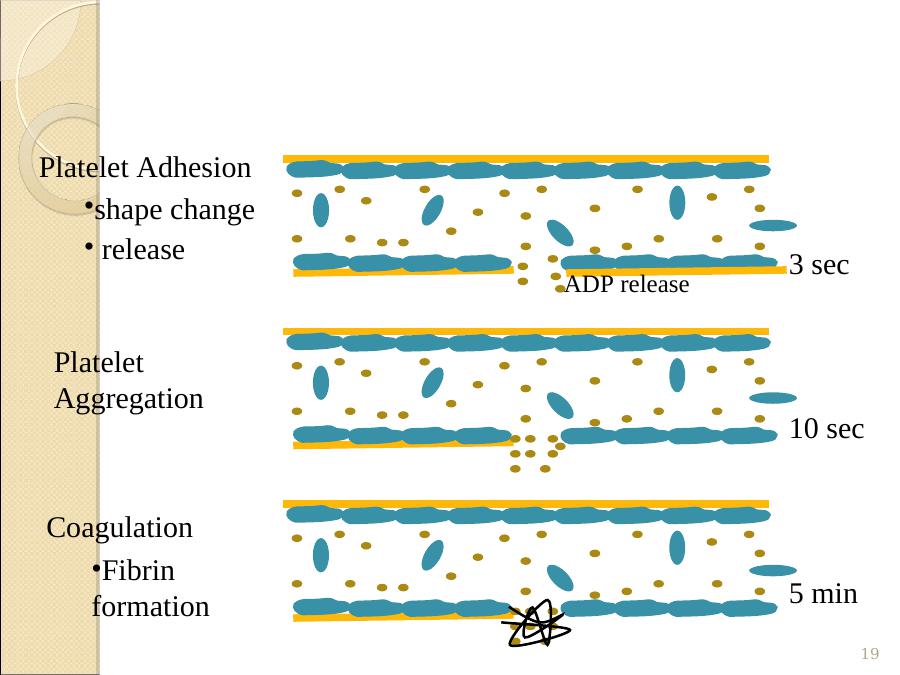 19 Platelet Adhesion •shape change • release ADP release Platelet Aggregation Coagulation •Fibrin formation 3 sec 10 sec 5 min
