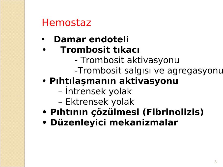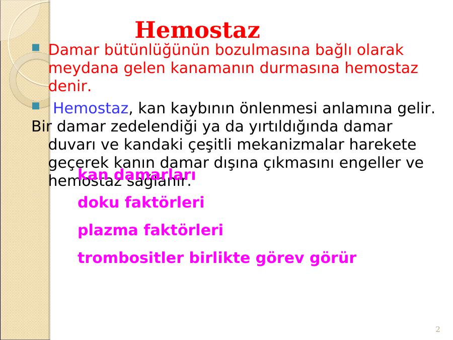 Hemostaz Damar bütünlüğünün bozulmasına bağlı olarak meydana gelen kanamanın durmasına hemostaz denir. Hemostaz, kan kaybının önlenmesi anlamına gelir. Bir damar zedelendiği ya da yırtıldığında damar duvarı ve kandaki çeşitli mekanizmalar harekete geçerek kanın damar dışına çıkmasını engeller ve hemostaz sağlanır. kan damarları doku faktörleri plazma faktörleri trombositler birlikte görev görür 2