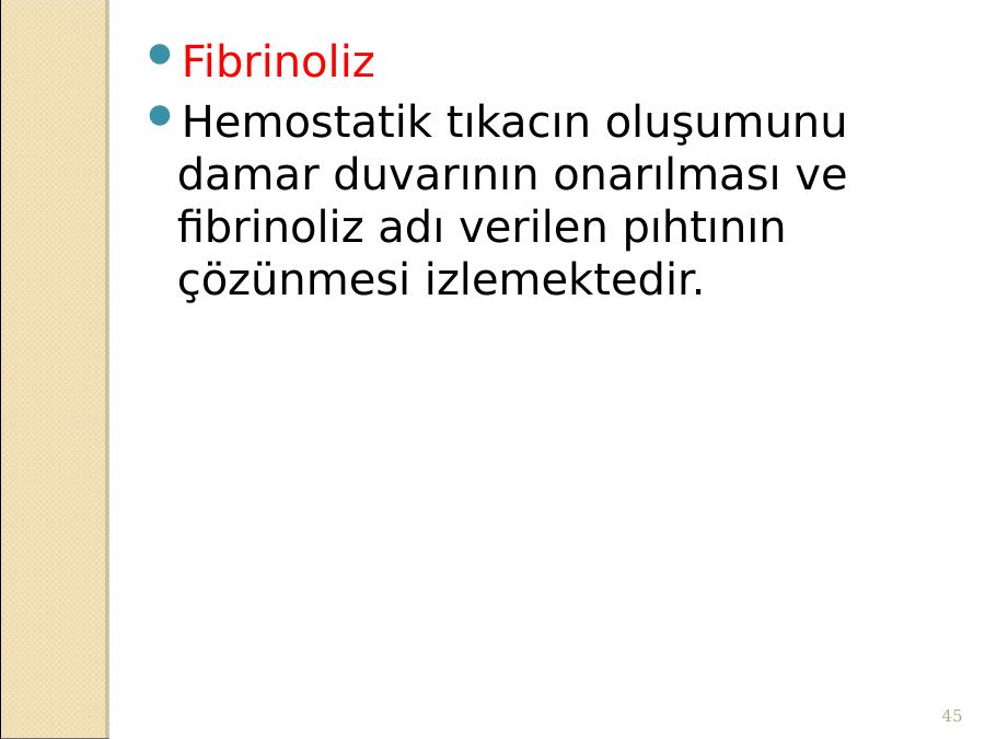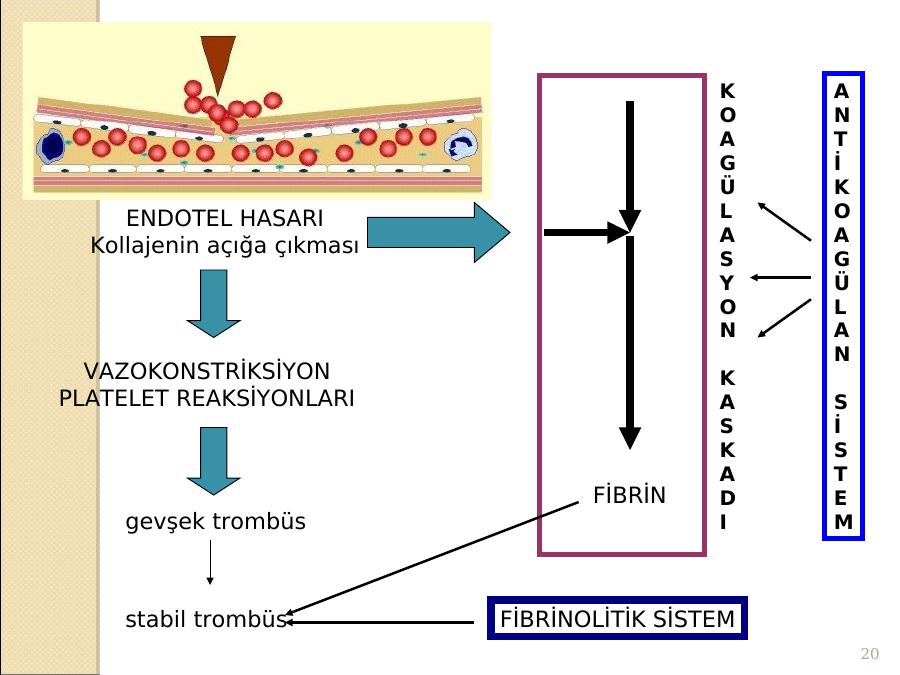 45 Fibrinoliz Hemostatik tıkacın oluşumunu damar duvarının onarılması ve fibrinoliz adı verilen pıhtının çözünmesi izlemektedir.