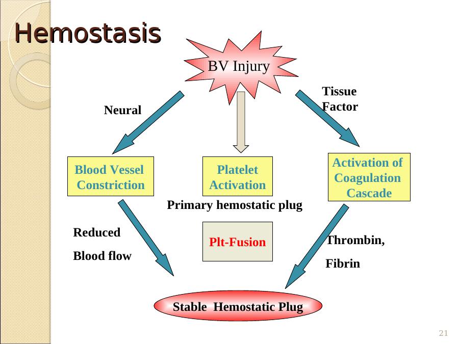 Hemostasis 21 BV Injury Platelet Activation Plt-Fusion Blood Vessel Constriction Activation of Coagulation Cascade Stable Hemostatic Plug Thrombin, Fibrin Reduced Blood flow Tissue Factor Primary hemostatic plug Neural
