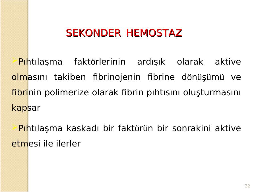 SEKONDER HEMOSTAZ Pıhtılaşma faktörlerinin ardışık olarak aktive olmasını takiben fibrinojenin fibrine dönüşümü ve fibrinin polimerize olarak fibrin pıhtısını oluşturmasını kapsar Pıhtılaşma kaskadı bir faktörün bir sonrakini aktive etmesi ile ilerler 22