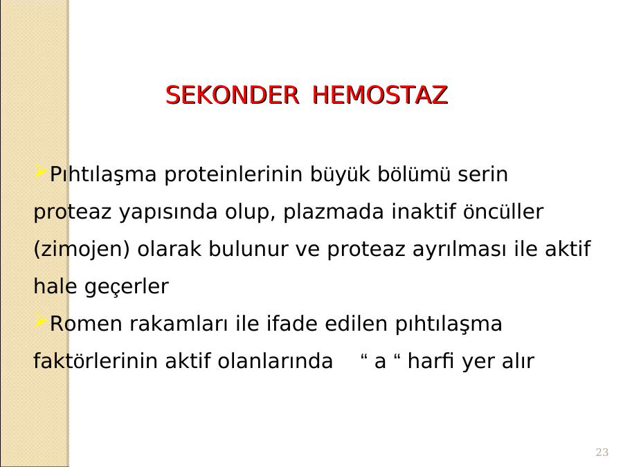SEKONDER HEMOSTAZ Pıhtılaşma proteinlerinin büyük bölümü serin proteaz yapısında olup, plazmada inaktif öncüller (zimojen) olarak bulunur ve proteaz ayrılması ile aktif hale geçerler Romen rakamları ile ifade edilen pıhtılaşma faktörlerinin aktif olanlarında “ a “ harfi yer alır 23
