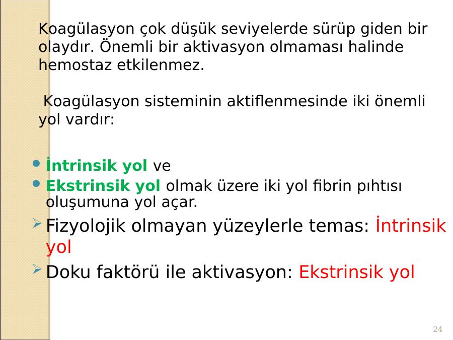 24 İntrinsik yol ve Ekstrinsik yol olmak üzere iki yol fibrin pıhtısı oluşumuna yol açar. Fizyolojik olmayan yüzeylerle temas: İntrinsik yol Doku faktörü ile aktivasyon: Ekstrinsik yol Koagülasyon çok düşük seviyelerde sürüp giden bir olaydır. Önemli bir aktivasyon olmaması halinde hemostaz etkilenmez. Koagülasyon sisteminin aktiflenmesinde iki önemli yol vardır: