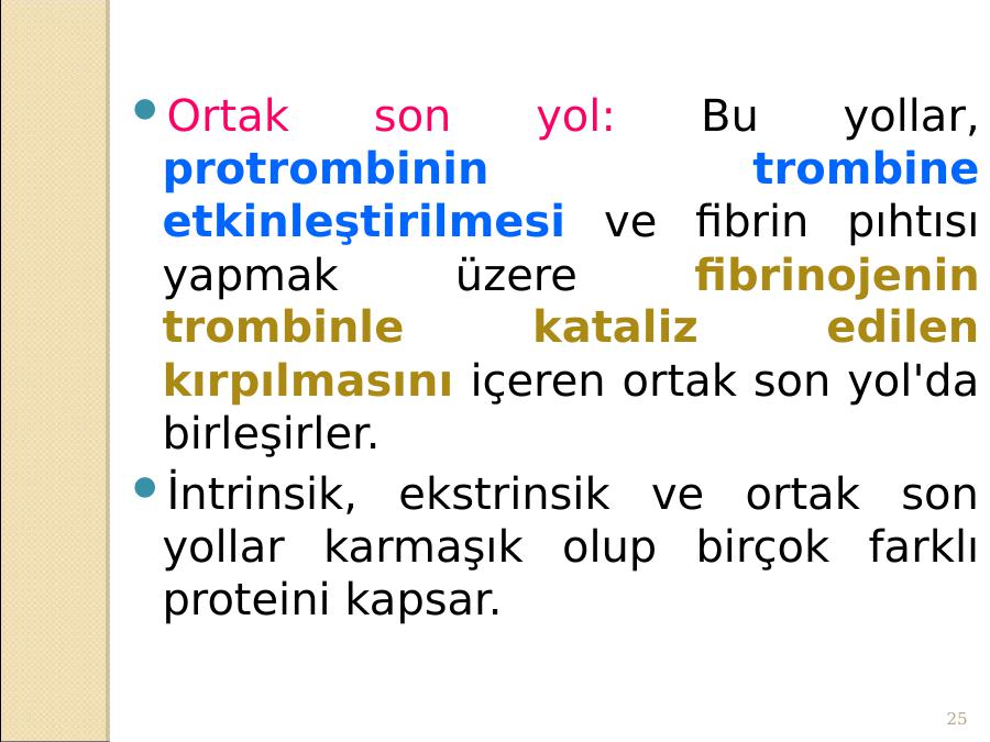 25 Ortak son yol: Bu yollar, protrombinin trombine etkinleştirilmesi ve fibrin pıhtısı yapmak üzere fibrinojenin trombinle kataliz edilen kırpılmasını içeren ortak son yol'da birleşirler. İntrinsik, ekstrinsik ve ortak son yollar karmaşık olup birçok farklı proteini kapsar.