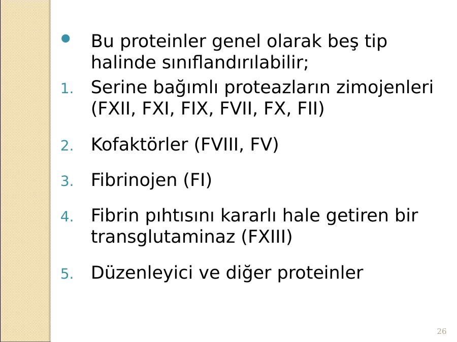 26 Bu proteinler genel olarak beş tip halinde sınıflandırılabilir; 1. Serine bağımlı proteazların zimojenleri (FXII, FXI, FIX, FVII, FX, FII) 2. Kofaktörler (FVIII, FV) 3. Fibrinojen (FI) 4. Fibrin pıhtısını kararlı hale getiren bir transglutaminaz (FXIII) 5. Düzenleyici ve diğer proteinler