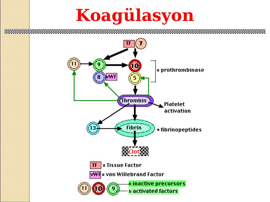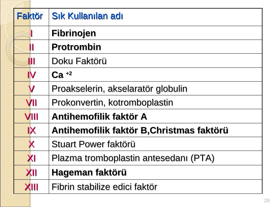 Faktör Sık Kullanılan adı I Fibrinojen II Protrombin III Doku Faktörü IV Ca +2 V Proakselerin, akselaratör globulin VII Prokonvertin, kotromboplastin VIII Antihemofilik faktör A IX Antihemofilik faktör B,Christmas faktörü X Stuart Power faktörü XI Plazma tromboplastin antesedanı (PTA) XII Hageman faktörü XIII Fibrin stabilize edici faktör 28