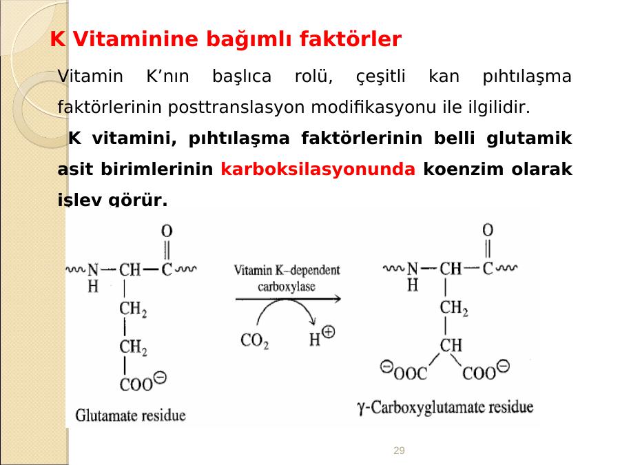 29 K Vitaminine bağımlı faktörler Vitamin K’nın başlıca rolü, çeşitli kan pıhtılaşma faktörlerinin posttranslasyon modifikasyonu ile ilgilidir. K vitamini, pıhtılaşma faktörlerinin belli glutamik asit birimlerinin karboksilasyonunda koenzim olarak işlev görür.