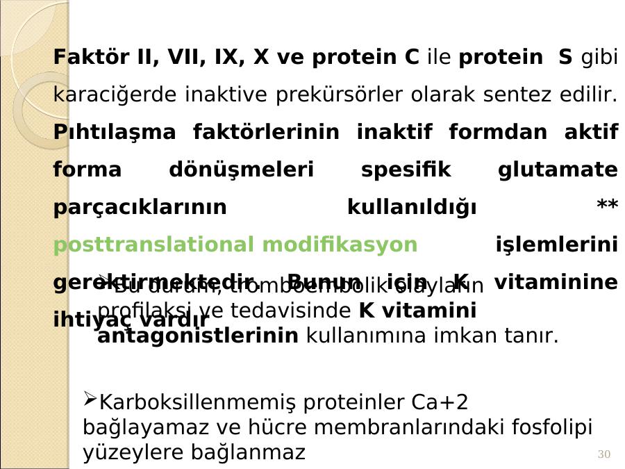 30 Faktör II, VII, IX, X ve protein C ile protein S gibi karaciğerde inaktive prekürsörler olarak sentez edilir. Pıhtılaşma faktörlerinin inaktif formdan aktif forma dönüşmeleri spesifik glutamate parçacıklarının kullanıldığı ** posttranslational modifikasyon işlemlerini gerektirmektedir. Bunun için K vitaminine ihtiyaç vardır Bu durum, tromboembolik olayların profilaksi ve tedavisinde K vitamini antagonistlerinin kullanımına imkan tanır. Karboksillenmemiş proteinler Ca+2 bağlayamaz ve hücre membranlarındaki fosfolipi yüzeylere bağlanmaz