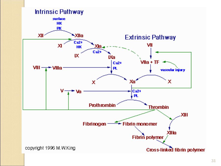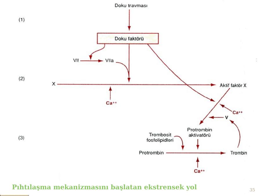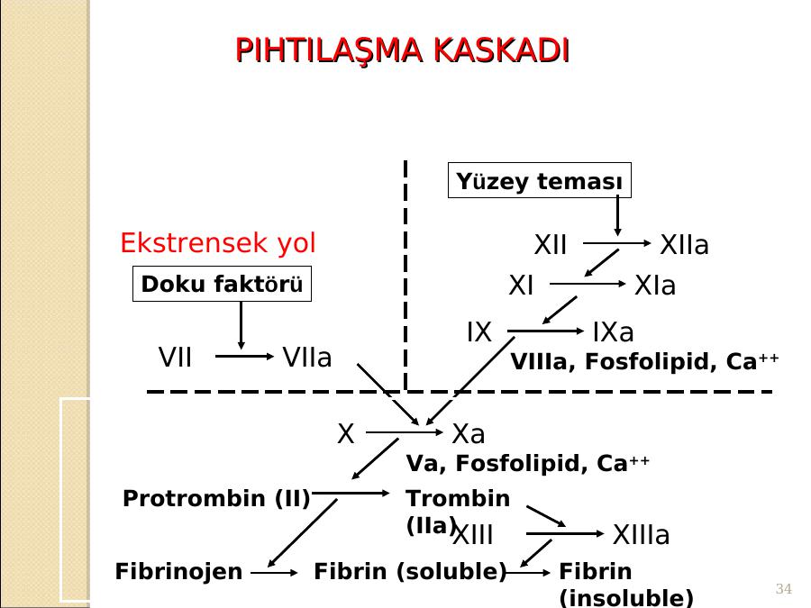 PIHTILAŞMA KASKADI Ekstrensek yol Doku faktörü VII VIIa Yüzey teması XII XIIa XI XIa IX IXa VIIIa, Fosfolipid, Ca++ X Xa Va, Fosfolipid, Ca++ Protrombin (II) Trombin (IIa) Fibrinojen Fibrin (soluble) Fibrin (insoluble) XIII XIIIa 34