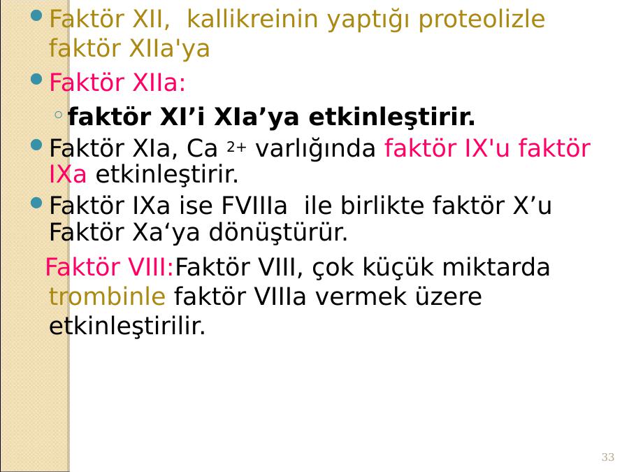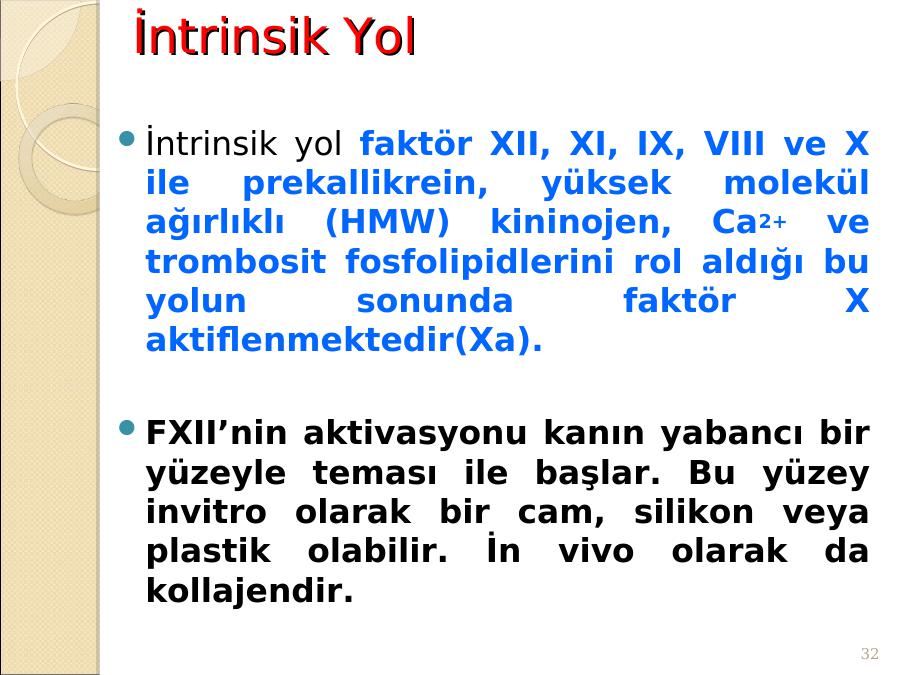 İntrinsik Yol İntrinsik yol faktör XII, XI, IX, VIII ve X ile prekallikrein, yüksek molekül ağırlıklı (HMW) kininojen, Ca2+ ve trombosit fosfolipidlerini rol aldığı bu yolun sonunda faktör X aktiflenmektedir(Xa). FXII’nin aktivasyonu kanın yabancı bir yüzeyle teması ile başlar. Bu yüzey invitro olarak bir cam, silikon veya plastik olabilir. İn vivo olarak da kollajendir. 32