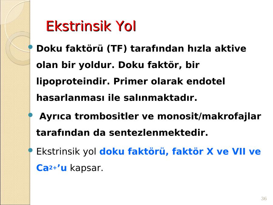 Ekstrinsik Yol Doku faktörü (TF) tarafından hızla aktive olan bir yoldur. Doku faktör, bir lipoproteindir. Primer olarak endotel hasarlanması ile salınmaktadır. Ayrıca trombositler ve monosit/makrofajlar tarafından da sentezlenmektedir. Ekstrinsik yol doku faktörü, faktör X ve VII ve Ca2+’u kapsar. 36